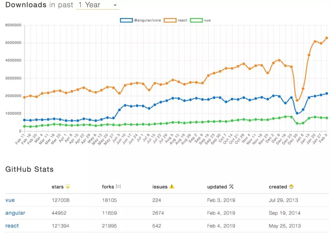 根据 npm trending 的统计 React、Vue 和 Angular 的 npm 包安装数据来看,2018年 React 依然是独领风骚。