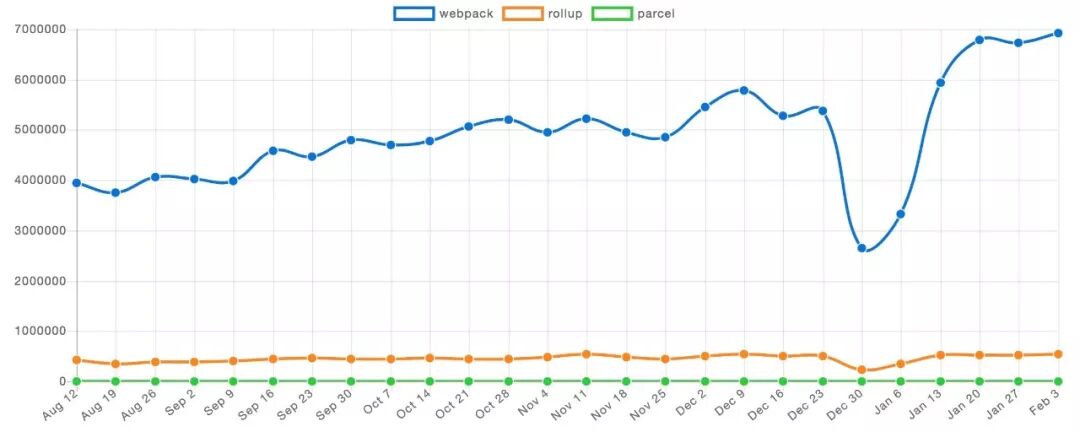 作为目前受关注比较高的三款前端打包工具,这三个打包工具的诞生都有一定的年份了,相信大家都有所了解。其中起步最早的是 Webpack,创建于 2012 年 3 月。从 npm trending 图可以看出,它是一骑绝尘远远的甩开了另外的两个个竞争对手。Webpack 是为 Web 应用打包而设计,它的设计理念是将一切资源文件都当作模块通过 plugins 和 loaders 处理。Rollup 定位于 JavaScript 打包,它对 ES Module 有着较好的支持。tree shaking 的优化理念也是最先在 rollup 中提出。相对于 webpack 它打包速度更快,打出来的包的体积也更小。Rollup 是 JS 库打包的首选。Parcel 是三个中起步最晚的,创建于 2017 年 8 月,它的使用场景和 webpack 基本一致。 Parcel 的诞生是以零配置为噱头,当时也是赚足了眼球。它与前面两个工具最大的不同之处在于它是以 html 做为入口文件,这点比较契合浏览器的文件加载过程。正是因为 Parcel 的零配置和以 html 文件为入口,所以我之前一直把它当作一个快捷的本地的开发服务器来使用(捂脸。随着应用的膨胀,零配置基本是不可能的。但是 Parcel 的出现倒是引起了 webpack 的紧张,所以 webpack 在 4.0 版本添加了很多默认配置项。从目前来看 Parcel 还是比较难以撼动 webpack 的大哥地位,毕竟 webpack 积累了这么多年的生态。Parcel 未来还是值得关注的。