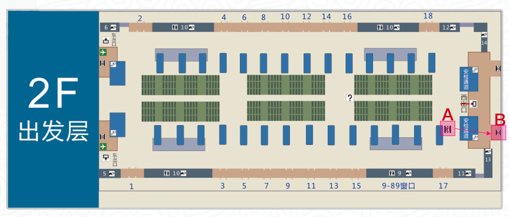 坐上工作人员开启的电梯,向上到达出发层,电梯位于上图A位置,在检票闸口内,出闸口再询问工作人员后得知,去到达层的电梯在安检通道外(上图B的位置),安检通道向外的出口,没有推车可以走的门,只能逆向穿越安检设施以及等待进入候客室的人群,最后到达向下的电梯处。