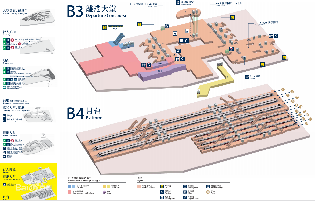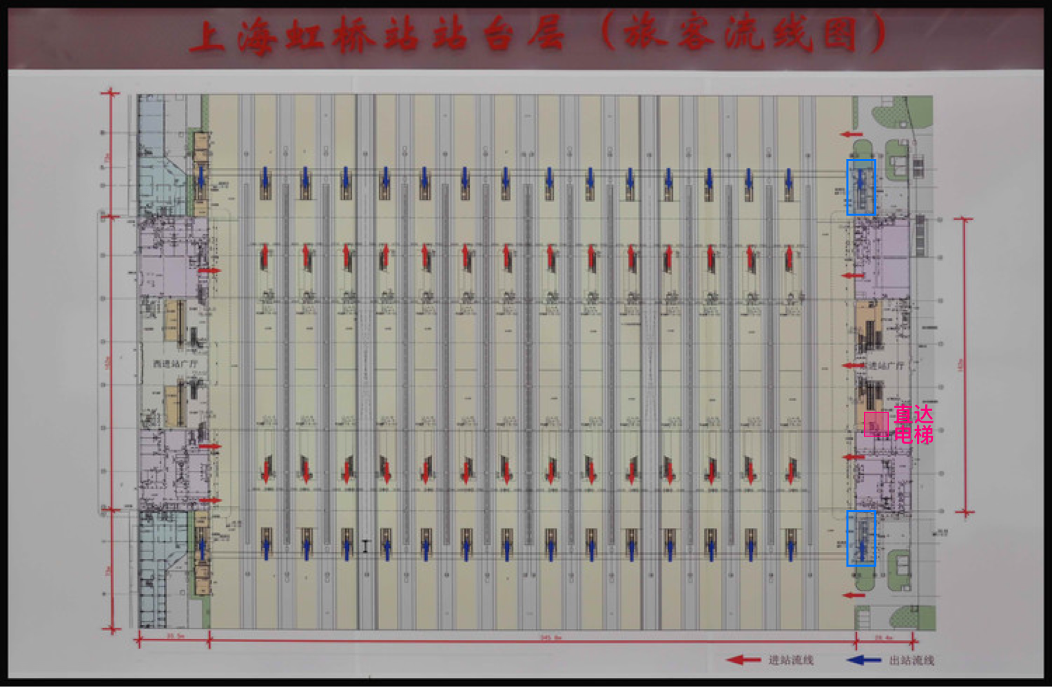 从出发的体验来说,两个高铁站都还不错,香港的优势从上面这张示意图可以看到,一共有48台直达电梯,并且每一台都非常宽大,轻松容纳我们三大二小所有装备,还能装下其他不少乘客,应该超过无障碍设计规范中的中型电梯规格(1.60*1.40m),比医疗建筑选用的病床专用电梯还要宽,非常符合交通枢纽站,乘客携带大型行李以及推婴儿车都非常的舒适宽敞。出电梯后地面指示标识以及悬挂的指示标牌也非常明确。