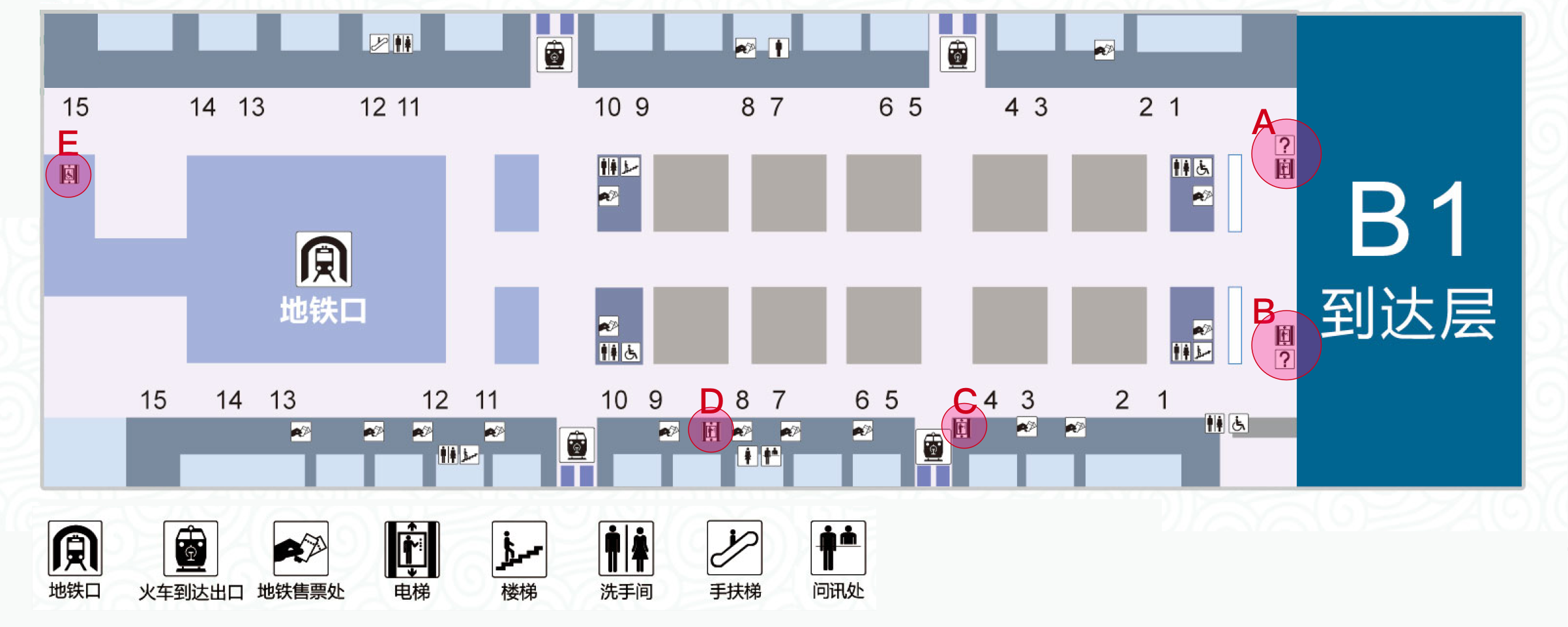 看上图,我乘坐的是A、B电梯之一,C、D为高铁闸口内电梯,F为地铁电梯,也就是说,整个到达层只有A、B这两个电梯可以为我们服务。