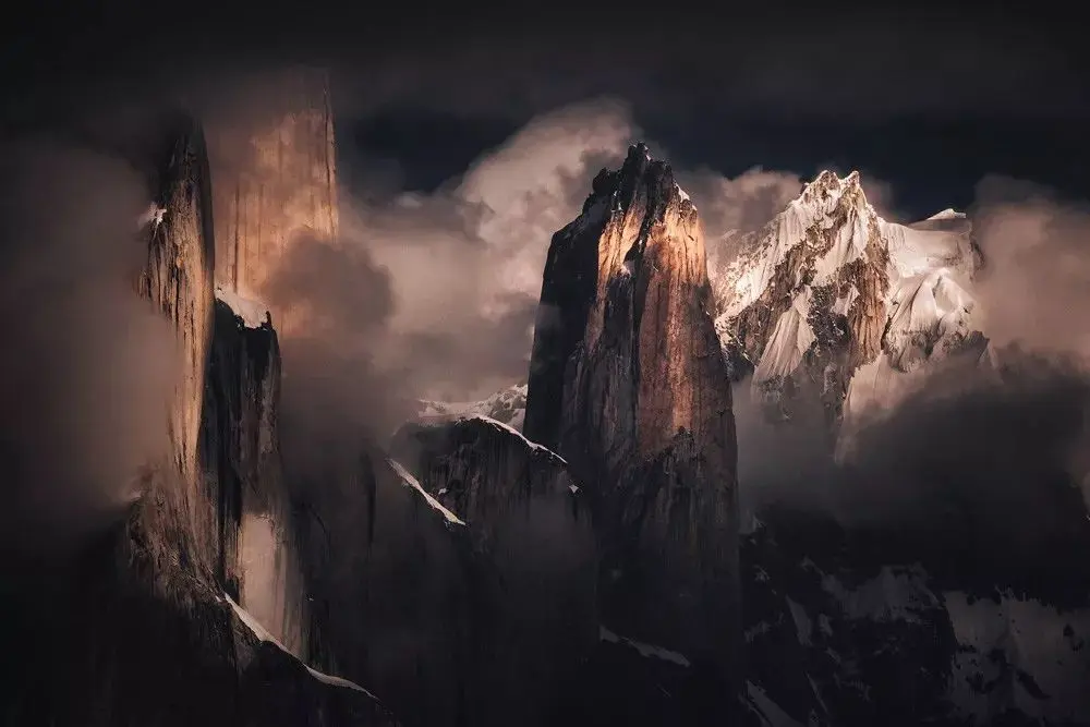 我很幸运的在一个乌云密布的上午,抓拍到了透过云层照亮山峰的光线。后期我进一步做成了暗调,来突出这些穿越黑暗的光,以及雪峰壮观的层次。这张照片也有幸获得了京东摄影金像奖风光类大奖。