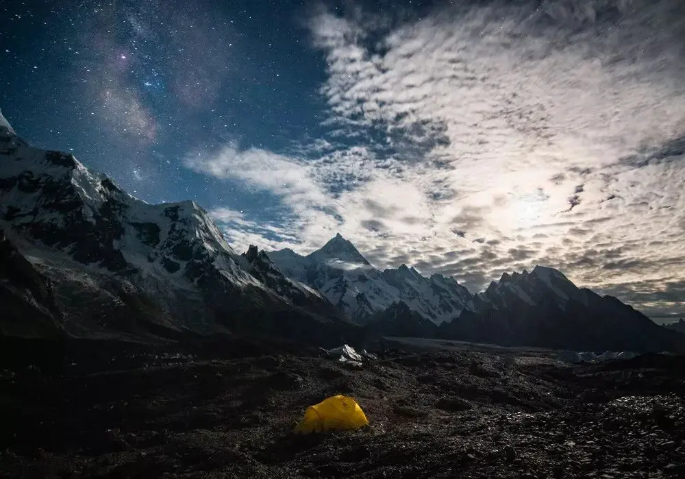 这张照片拍摄于今年我们的巴基斯坦徒步过程中,前景是一顶登山队的高山帐,远处是世界第22高的玛夏布洛姆峰。
