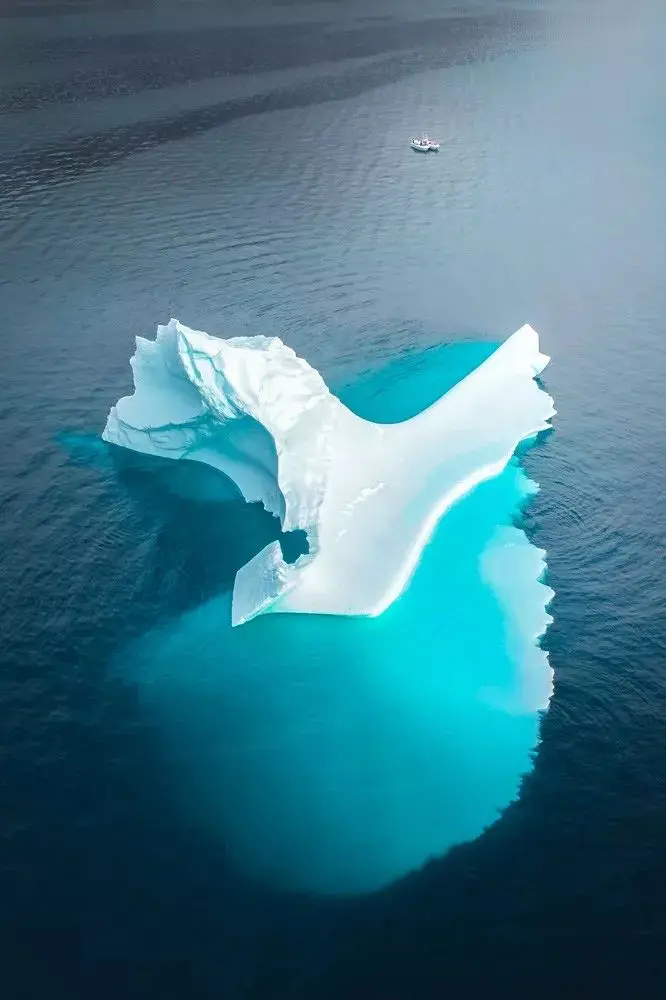 利用Mavic无人机,我们可以真正从空中看见其巨大的基座(冰山青色部分为水下)。