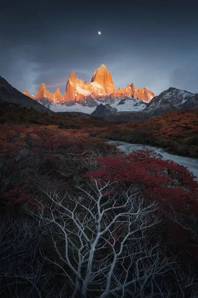 这张照片拍摄于深秋的巴塔哥尼亚,虽然远处的灌木仍然红的生机盎然,但近处的一些枝条,已经掉光了所有的叶子,进入了冬天的状态。