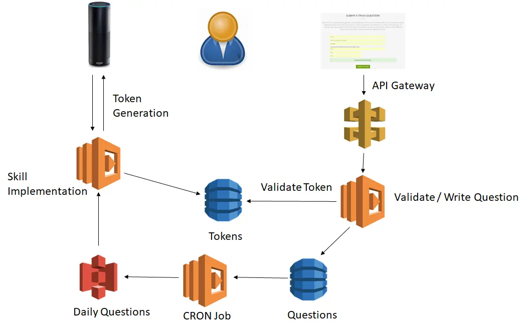 handle(handlerInput : HandlerInput) : Promise<Response> { const token = generateToken(handlerInput); // Record issuance of this token const params = { TableName: 'Tokens', Key: {token: token}, AttributeUpdates: {issued: { Action: 'ADD', Value: 1, }}, };let speech = 'Visit out website to enter a question, using the code {Token}'; speech = speech.replace('{Token}', token);return doc.update(params).promise().then((data) => { speechParams['Code'] = token; return handlerInput.responseBuilder .speak(speech) .reprompt('Visit our website to enter a question') .withSimpleCard('Trivia Game', speech) .getResponse(); });},This same token is used when processing the list of daily questions from S3 to make sure that we don’t present the user with their own questions. This list is generated daily from our Questions database via a Lambda function. It has enough entries so users get a full list of questions even if some are removed.