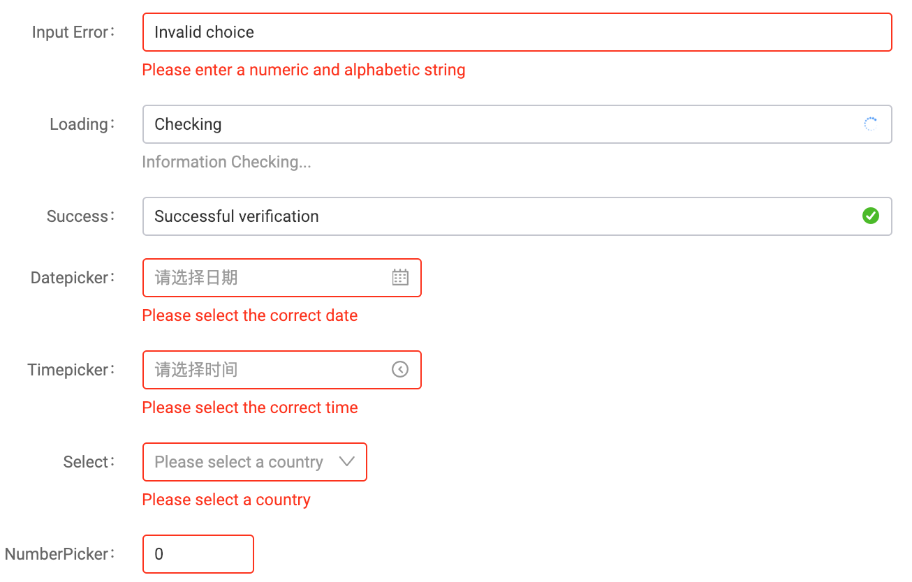 每个组件的加载中、成功、失败,都由组件自己实现,Form 只是在校验的时候传递 state 给各个组件,这样不需要 Form 去关心每个组件应该展现为什么样!