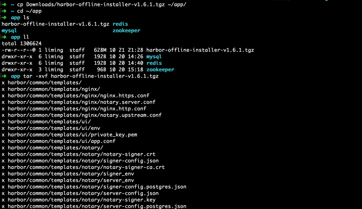 cp Downloads/harbor-offline-installer-v1.6.1.tgz ~/app/