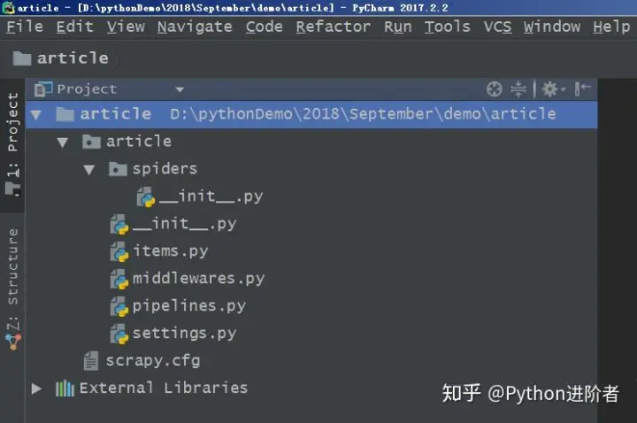 顶层的article文件夹是项目名,第二层中包含的是一个与项目名同名的文件夹article和一个文件scrapy.cfg,这个与项目同名的文件夹article是一个模块,所有的项目代码都在这个模块内添加,而scrapy.cfg文件是整个Scrapy项目的配置文件。第三层中有5个文件和一个文件夹,其中__init__.py是个空文件,作用是将其上级目录变成一个模块;items.py是定义储对象的文件,决定爬取哪些项目;middlewares.py文件是中间件,一般不用进行修改,主要负责相关组件之间的请求与响应;pipelines.py是管道文件,决定爬取后的数据如何进行处理和存储;settings.py是项目的设置文件,设置项目管道数据的处理方法、爬虫频率、表名等;spiders文件夹中放置的是爬虫主体文件(用于实现爬虫逻辑)和一个__init__.py空文件。
