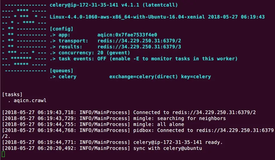 -A指明app所在的模块,这里是aqicn; worker表明当前机器的身份;-l是log的等级;-P是表明并发的方式,默认是单线程,这里使用的是协程;-c表示协程的数量,这里是20。协程数量不能太高,不然会出现大量的请求失败,导致没有数据。