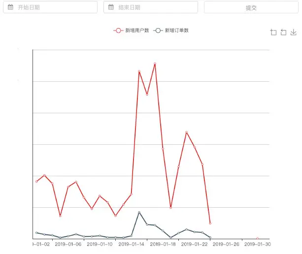 - 遍历列表,取当前日期和下一日期,查询出在这段时间内新增加的用户数和订单数
