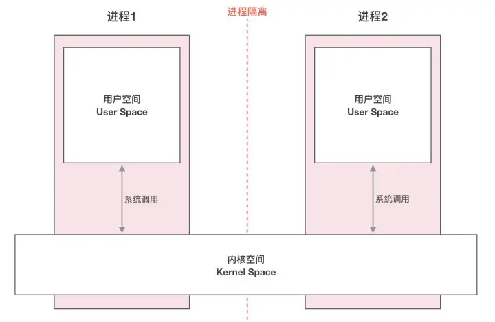 - 进程空间分为内核空间和用户空间,内核空间(Kernel)是系统内核运行的空间。用户空间(User Space)是用户程序运行的空间,他们之间是隔离的。