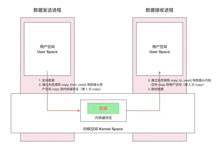 - 发送方进程通过系统调用 copy_from_user() 将数据 copy 到内核中的内核缓存区,由于内核缓存区和接收进程的用户空间存在内存映射,因此也就相当于把数据发送到了接收进程的用户空间,这样便完成了一次进程间的通信。