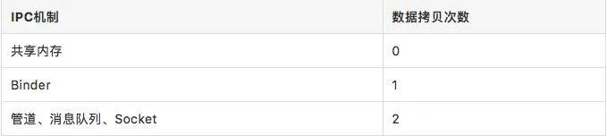 - Binder数据拷贝只需要一次,而消息队列、管道、Socket等需要两次,共享内存一次拷贝都不需要。Binder性能仅次于共享内存。