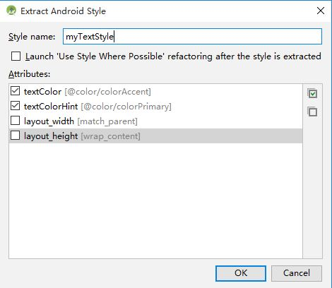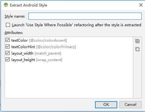 完成上面操作,会看到一个 Extract Android Style 对话中,显示了该组件所有的可以提取属性。