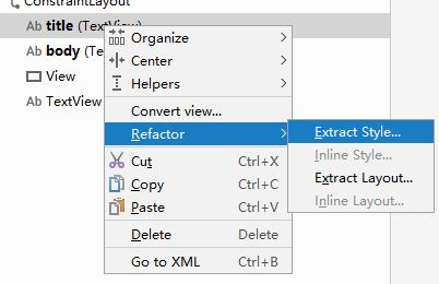 Android studio 提供了提取组件样式来作为 style 使用功能,这样大大地方便了开发人员。在设计设图中选择一个要提取 style 的组件,然后右键单击,在弹出菜单中选择 Refactor 然后选择 Extract Style... ,