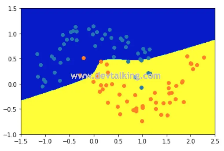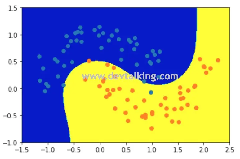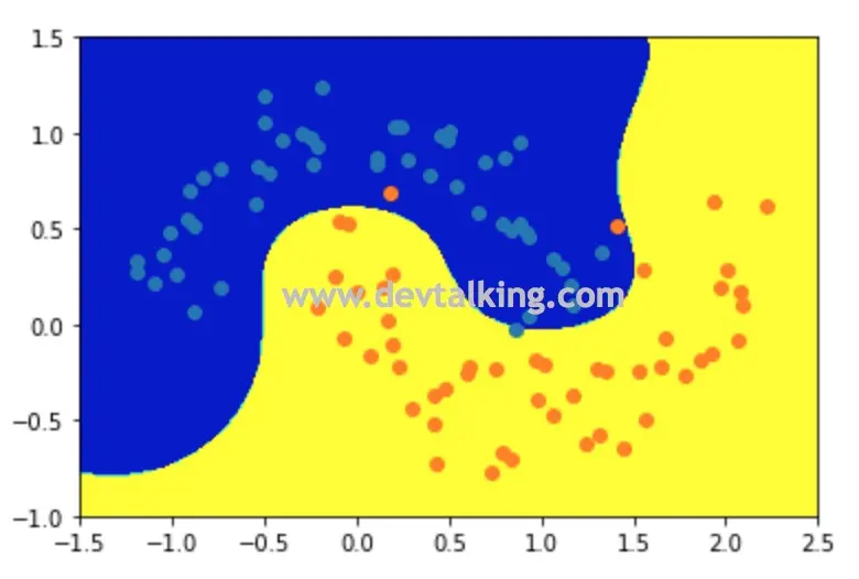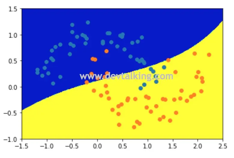 从上图可以看到决策边界的情况,很明显已经不是线性决策边界了,并且能较好的将两类点区分开。