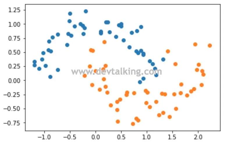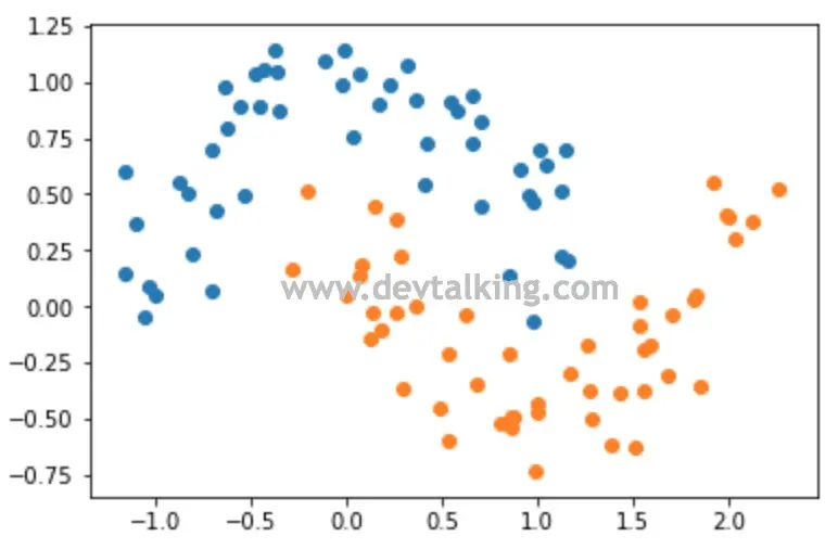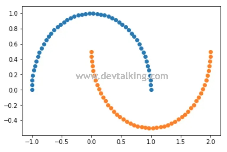 我们可以使用datasets提供的make_moons()函数生成非线性数据,默认为100行2列的矩阵,既100个样本数据,每个样本数据2个特征。可以使用n_samples参数指定样本数据数量。我们将其绘制出来看看: