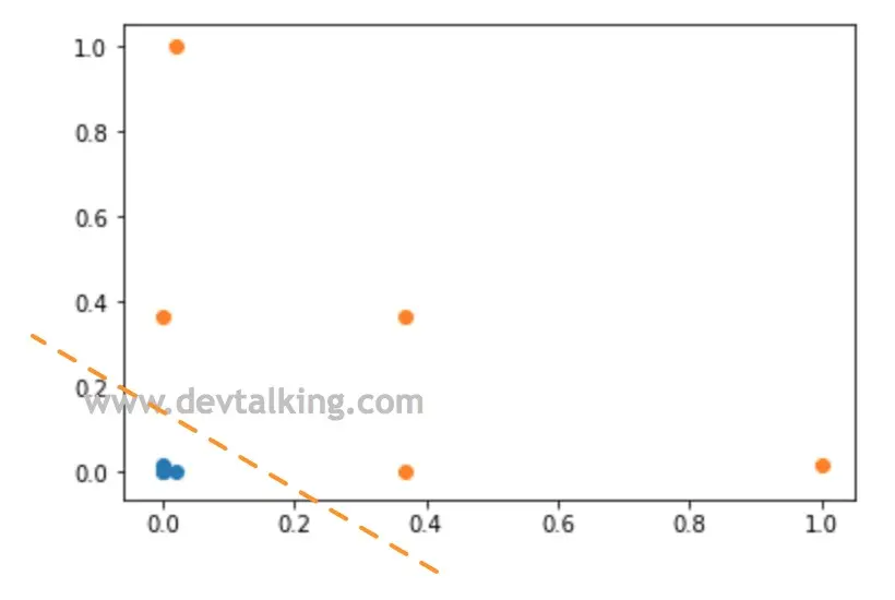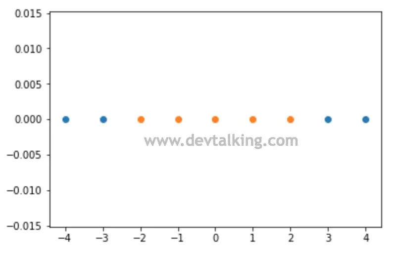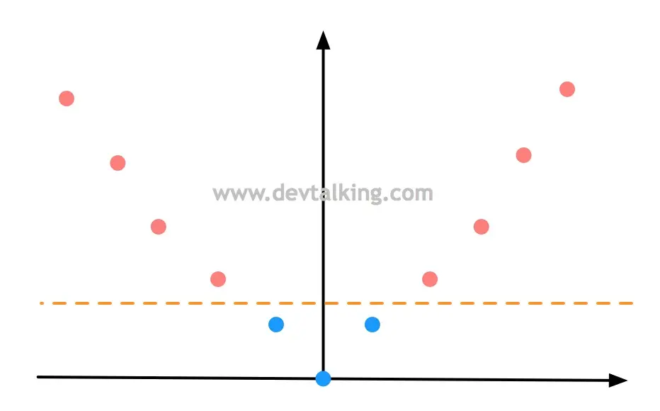 可以看到通过高斯函数将原本的一维样本数据转换为二维后,新样本数据明显成为线性可分的状态。