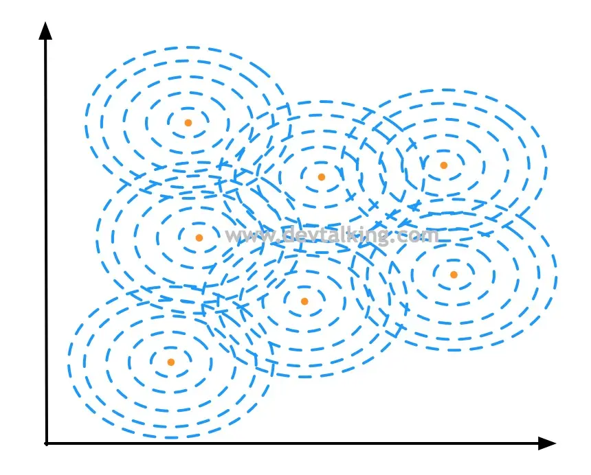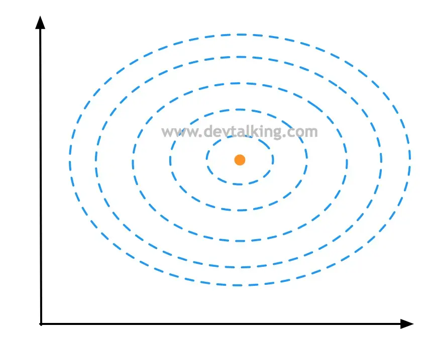如上图所示,蓝色虚线表示等高线,橘黄色点表示一个样本点,所以上面的图其实是俯视以橘黄色样本点为峰值点的高斯分布图。