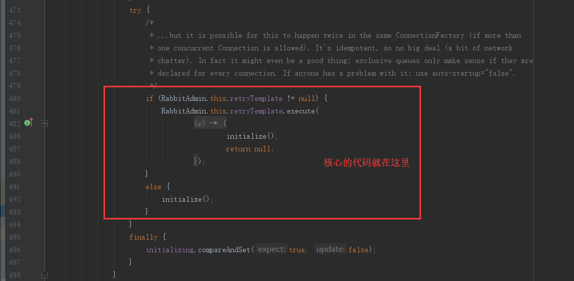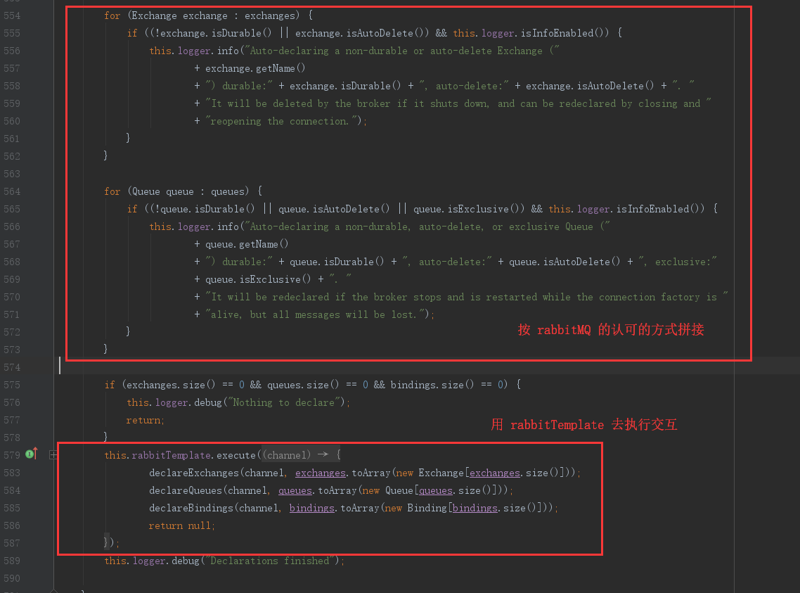 RabbitAdmin 类 的底层实现就是从 Spring 容器中获取 exchange、Bingding、routingkey 以及queue 的 @bean 声明,然后使用 rabbitTemplate 的 execute 方法进行执行对应的声明、修改、删除等一系列 rabbitMQ 基础功能操作。例如添加交换机、删除一个绑定、清空一个队列里的消息等等