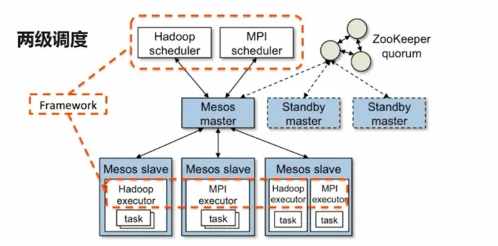 - Mesos master是支持高可用集群的,通过zookeeper完成的主节点选举