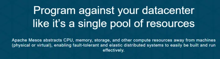 mesos.apache.org/ 在你的数据中心 运行数据(很多台数据的集合),就像运行在单个的资源池一样 Mesos 抽象出来CPU,内存,磁盘和其他计算机资源从物理机或者虚拟机中,使具有容错的和可伸缩的系统更容易的构建和简单的运行。如果是没有基础的老铁,可能是认为是直接把服务器的硬件插拔出来重新组建一台新的机器,其实不是这样的,他是通过软件的方式把需要的硬件设备抽取出来,统一的调度,合理的利用这些资源。