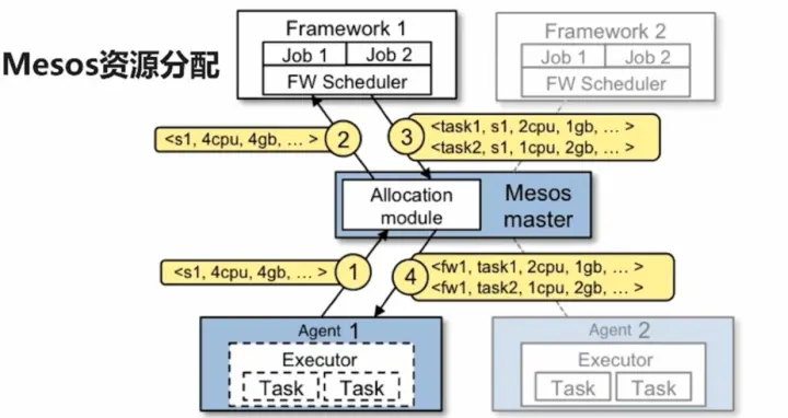 - Mesos向slave下发任务,并且分配适当的资源,给Franmework的执行器,接下来有执行器启动这2个任务,fw1,task1; fw2,task2;