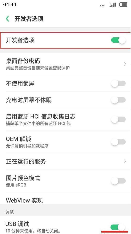 最后,打开开启开发者选项选项,并打开界面下面的“USB调试”选项。