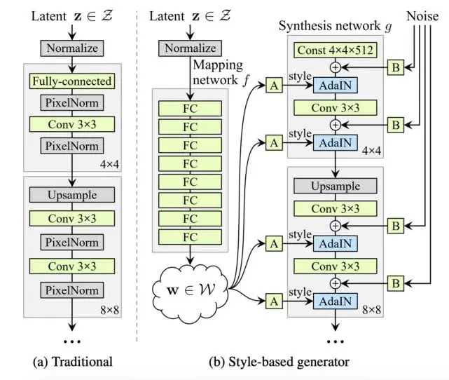 在传统方式中,隐码(latent code)是通过输入层提供给生成器的,即前馈网络的第一层(图1a)。而英伟达团队完全省略了输入层,从一个学习的常量(learned constant)开始,从而脱离了传统的设计(图1b,右)。在输入隐空间Z中,给定一个隐码z,一个非线性网络 f:Z→W首先生成w∈W(图1b,左)。