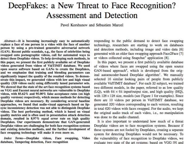 去年底,Idiap 生物识别安全和隐私小组负责人 (注:Idiap研究所是瑞士的一家半私人非营利性研究机构,隶属于洛桑联邦理工学院和日内瓦大学,进行语音、计算机视觉、信息检索、生物认证、多模式交互和机器学习等领域的研究)、瑞士生物识别研究和测试中心主任 Sébastien Marcel 和他的同事、Idiap 研究所博士后 Pavel Korshunov 共同撰写了论文,首次对人脸识别方法检测 DeepFake 的效果进行了较为全面的测评。