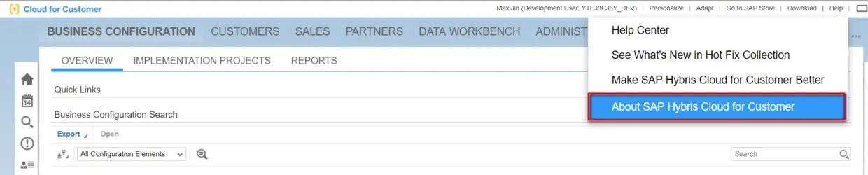 C4C的版本号在Help->About SAP Hybris Cloud for Customer里能看到: