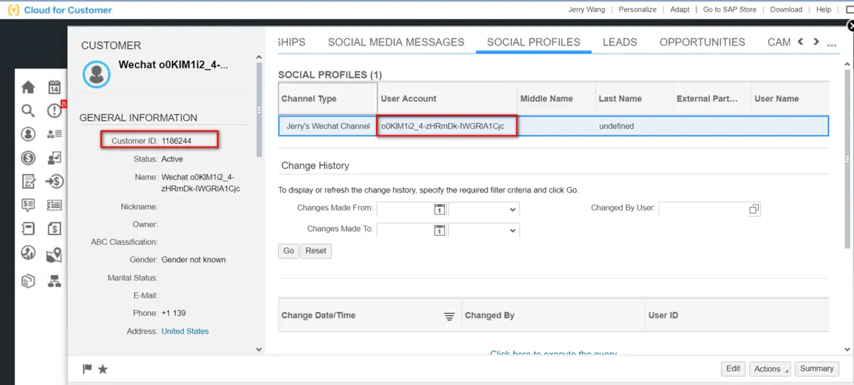 看一个具体例子:C4C里Individual Customers可以维护Social User Profile,在Jerry上面的公众号文章里,正是把微信用户的open ID维护到Social User Profile的SocialMediaAccountUserID字段去,如下图所示。