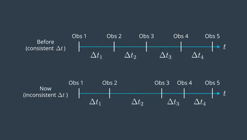 线性模型假设,物体在运动时,每段时间间隔中速度恒定。实际上,每次测量时间之间的间隔是不定的,物体的加速也是不定的