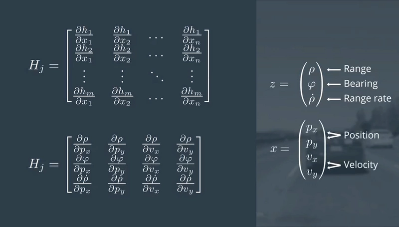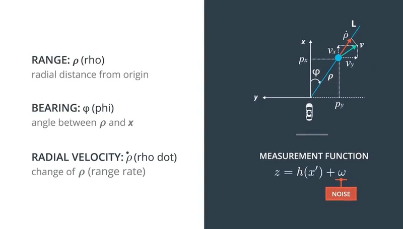 雷达信息包含了三个变量:Range范围(与路人的距离); Bearing方位(从x轴开始逆时针转向路人方向的角度); Radial Velocity是车速在行人方向上的速度分量,也叫range rate