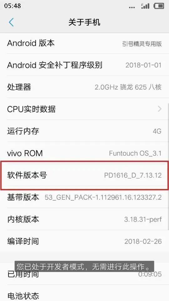 第四步进入到关于手机界面之后,连续点击“软件版本号”一栏,直到看出弹出“您已进入开发者模式”的提示文字。