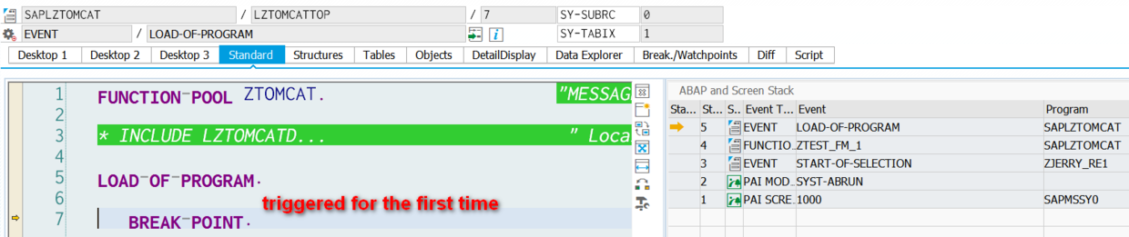 以Function group为例,每当一个function group里的任意一个function module第一次被调用时,对应的ABAP program被加载到internal session里,同时ABAP运行时抛出LOAD-OF-PROGRAM, 执行应用程序员编写的事件处理逻辑。