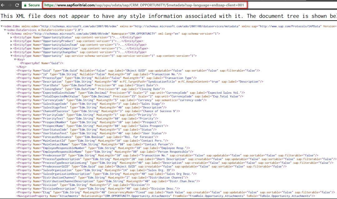 直接在浏览器里访问这个链接,就能观察到包含在链接里名为CRM_OPPORTUNITY的OData服务的metadata(元数据)。我们可以把一个OData服务的模型类比成一个SAP Business Object,该模型同样由一个根节点和若干子节点组成,每个节点包含若干字段。某些节点提供了一些可以执行的逻辑,在OData协议里称这些逻辑为function import(相当于Business Object里的action)。不同节点之间通过定义Navigation建立关联关系——SAP基于Netweaver的不同产品的建模方式思路都类似,可以触类旁通。