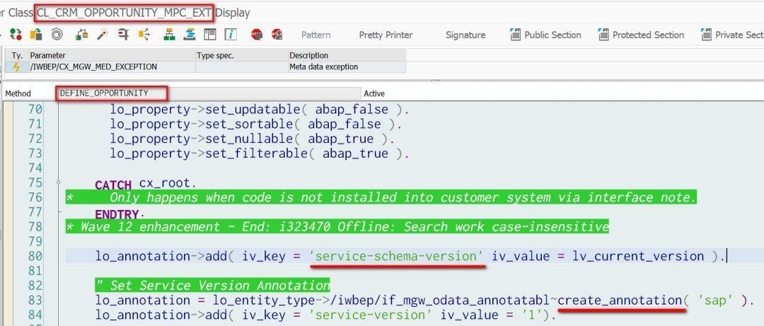 **MPC和MPC_EXT:**当消费者访问该服务的metadata时,这两个类负责把通过ABAP DDIC Structure描述的metadata信息转换成OData协议规范的格式并返回。每次开发人员修改OData模型,点击Generate按钮后,MPC的代码都会重新生成。如果开发人员需要在模型上添加一些额外信息,比如一些版本控制信息或者相关注解(annotation),那么需要在MPC_EXT里通过ABAP代码实现。MPC_EXT是MPC的子类,其代码不会被Generate按钮覆盖。一个例子如下:
