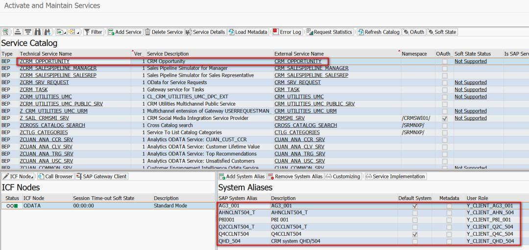 下图是OData服务在ABAP Front-End服务器的注册界面。从下图能看出理论上一台ABAP Front-End服务器可以连接多台ABAP Back-End服务器,