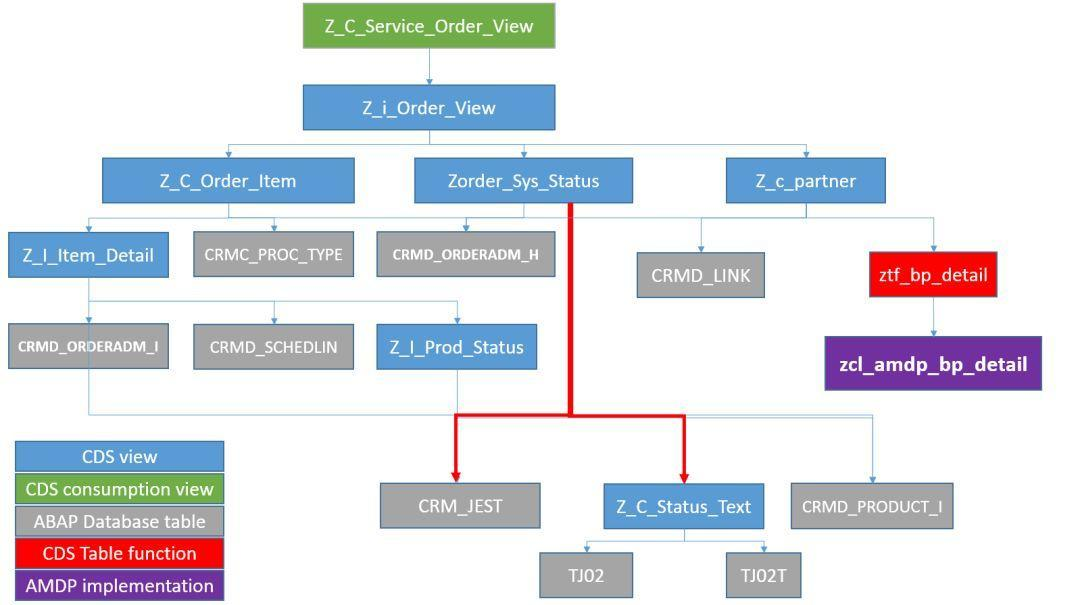 我们需要创建一个CDS view,用它来自动生成OData的模型和服务,即下图绿色的Z_C_Service_Order_View。该View又从其他更底层的CDS view取数据,将Service Order的抬头,行项目,状态信息等数据聚合在一起。