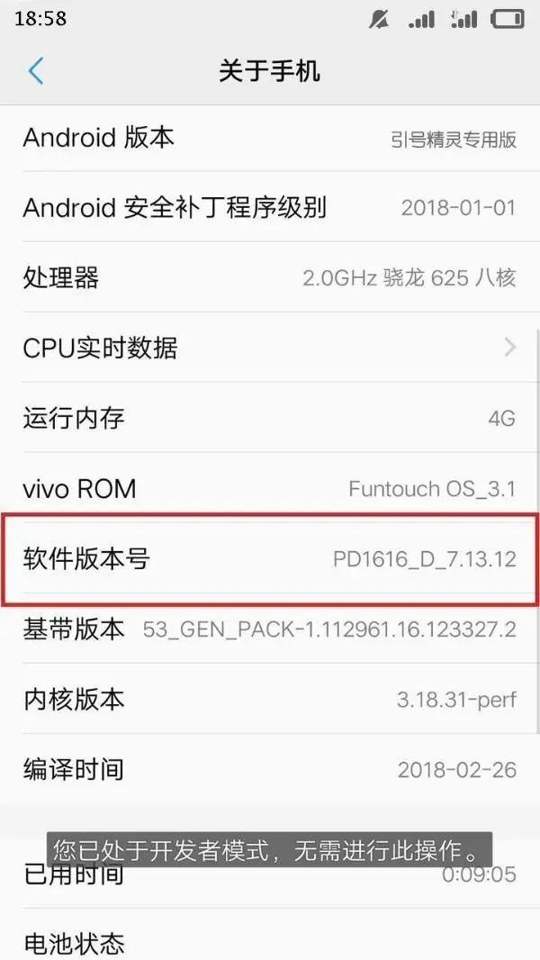 然后进入到“关于手机”界面之后,连续点击“软件版本号”一栏,直到看出弹出“您已进入开发者模式”的提示内容。