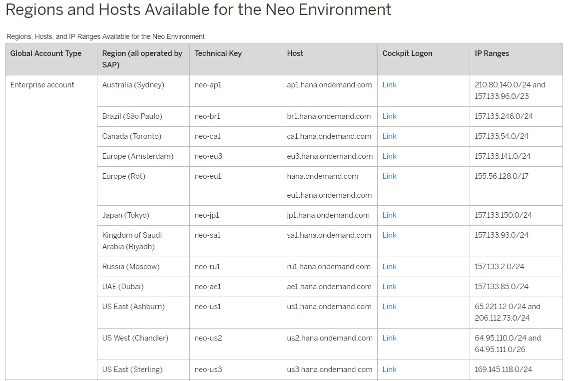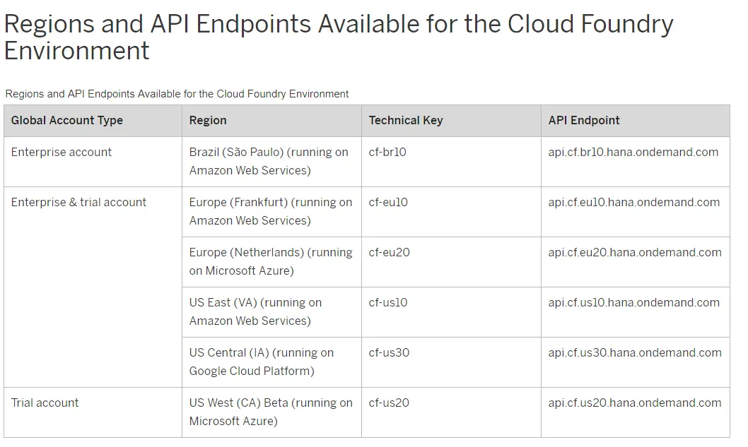SAP help里提供了CloudFoundry和Neo环境下可用的Region和API endpoint: