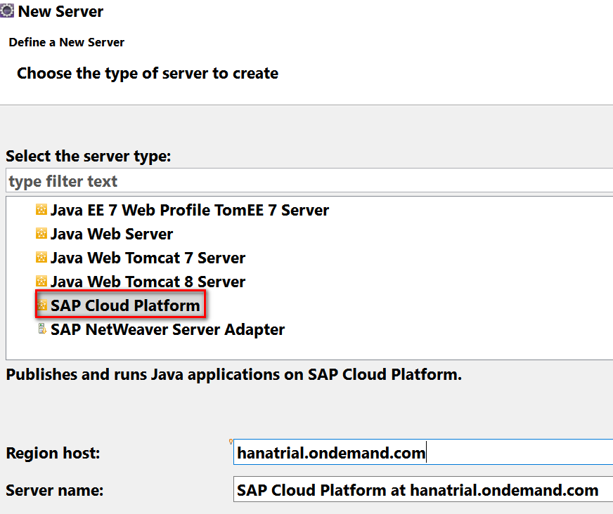将Java应用部署到SAP云平台neo环境的两种方式 已注销 2019-02-08 103 阅读1分钟 方法1 - 使用Eclipse Eclipse里新建一个服务器: 服务器类型选择SAP Cloud Platform: 点Finish,成功创建了一个Server: Eclipse里选择要部署的项目,右键->Run as Server, 选择上一步创建的Server即完成部署。 方法2 - 使用SAP云平台Cockpit 选择本地打包好的war文件,点击Deploy按钮: 部署成功: 要获取更多Jerry的原创技术文章,请关注公众号"汪子熙"或者扫描下面二维码: