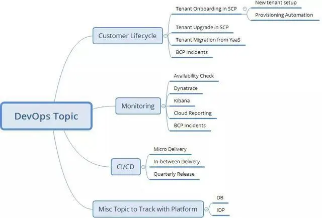就SAP成都Customer Engagement Center团队而言,团队目前处于已发版,有客户的状态。这意味着可能会有客户报过来的ticket,以及来自售前团队以及内部产品经理团队的demo 需求,也可能会有更多的内部ticket以及tenant setup的要求。因此DevOps同学会投入更多精力在Operation方面,其实也就是下图中的客户生命周期(Customer Life cycle)方面。