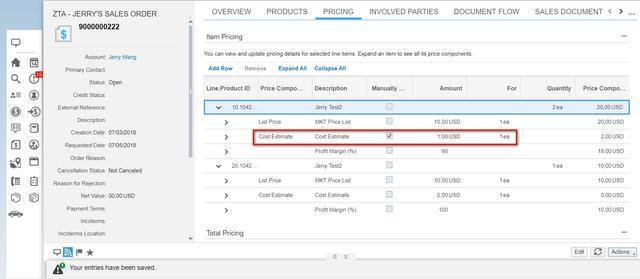 在PRICING标签页里,还可以手动添加其他的价格元素,比如给第一个行项目的每个产品添加1美元的成本(Product Cost):