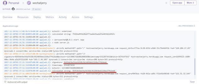 部署成功后,到微信订阅号操作台点Submit按钮提交验证请求,然后在Heroku应用的控制台上能观察到我们自己的微信服务器计算出的signature和微信平台发送的signature完全一致,认证通过。