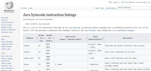 下面这个wiki包含了java字节码里每个指令的具体说明: