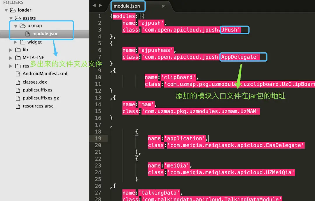 - 在module.json文件中添加未绑定的模块的json信息(name:为js中调用的表示名,class:为模块的主入口的java类,该类集成了UZModule.java类)
