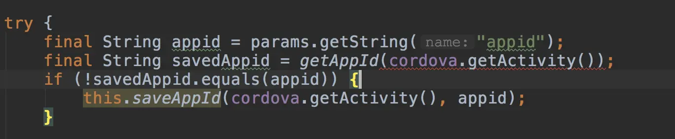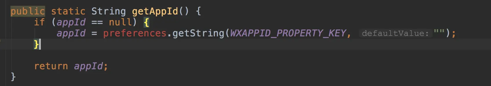 该方法调用getAppId()方法获取String类型的AppID并将值赋值给saveAppid。但是该方法传入了一个Activity。我们查看该方法时发现getAppId()方法并没有让传入任何参数。